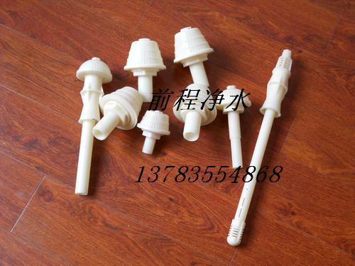 反冲洗滤帽;滤头是滤池底部配水系统汽水反冲冼装置,它能有效地冲洗出滤池中的污泥杂物,保证滤池水质水量正常运行;滤头的种类有(长、短柄)磨菇型、梅花型、塔型和圆柱型,均采用ABS工程塑料制成,结构合理,连接牢固,承压强度高,缝隙不变型,能使滤板间无死水角区,不积泥,效果好。长柄滤头常用于滤池汽水反冲洗配水系统;短柄滤头应用于单水反冲洗和重力式,压力式滤罐及离子交换滤床等水处理设备的过滤装置。滤头滤帽用于城市饮用水,工业用水净化,滤头滤帽是高纯水,矿泉水经营中的净化材料,滤头滤帽有效脱除水中的COD,色素,臭气毒害物质。