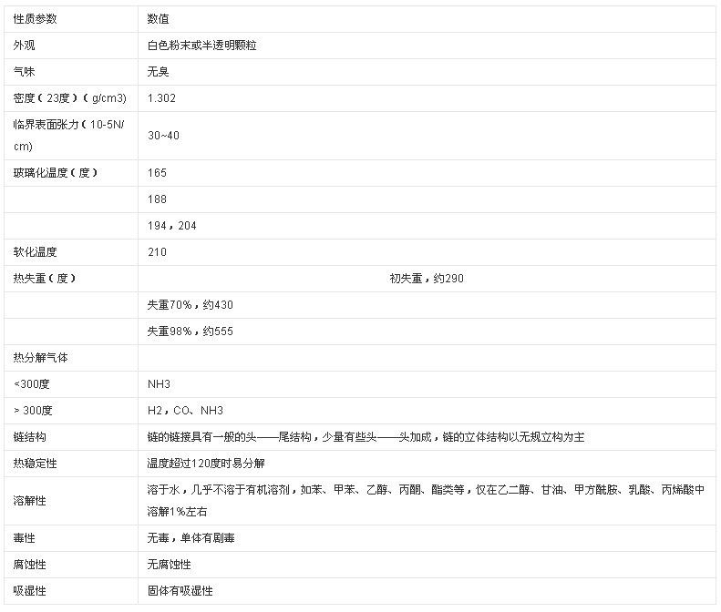 聚丙烯酰胺为白色粉末或者小颗粒状物,密度为1.32g/cm3(23度),玻璃化温度为188度,软化温度近于210度,一般方法干燥时含有少量的水,干时又会很快从环境中吸取水分,用冷冻干燥法分离的均聚物是白色松软的非结晶固体,但是当从溶液中沉淀并干燥后则为玻璃状部分透明的固体,完全干燥的聚丙烯酰胺PAM是脆性的白色固体,商品聚丙烯酰胺干燥通常是在适度的条件下干燥的,一般含水量为5%~15%,浇铸在玻璃板上制备的高分子膜,则是透明、坚硬、易碎的固体,固体聚丙烯酰胺的物理性质见表: